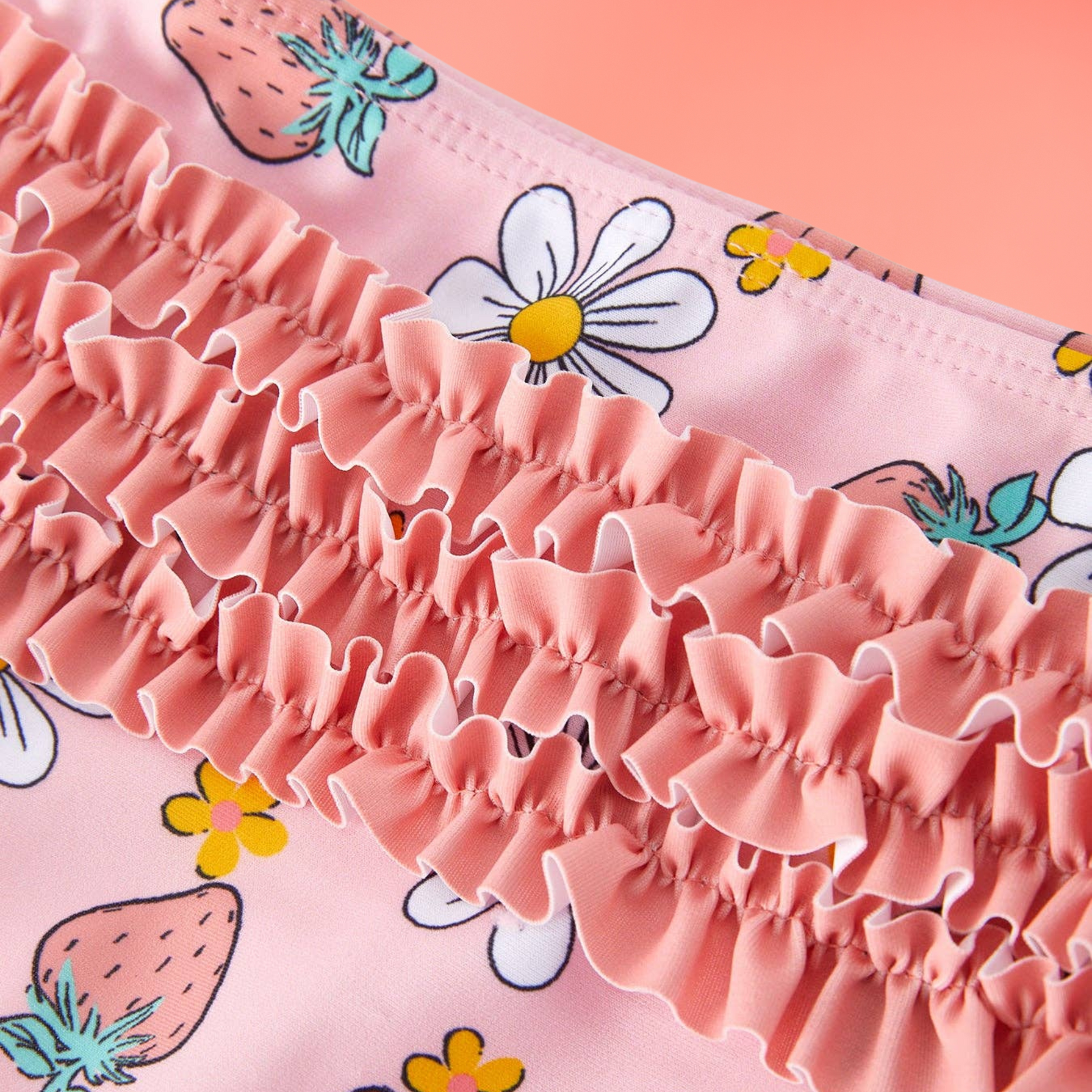 Let your little sunshine splash in style with our Sweet Strawberry Daisy Ruffle Swimsuit! This adorable two-piece features a soft pink background sprinkled with playful daisies and juicy strawberries, making it the ultimate summer vibe! The fluttery ruffle sleeves add a touch of charm, while the ruffled bottoms in the back bring extra cuteness to every cannonball and cartwheel.